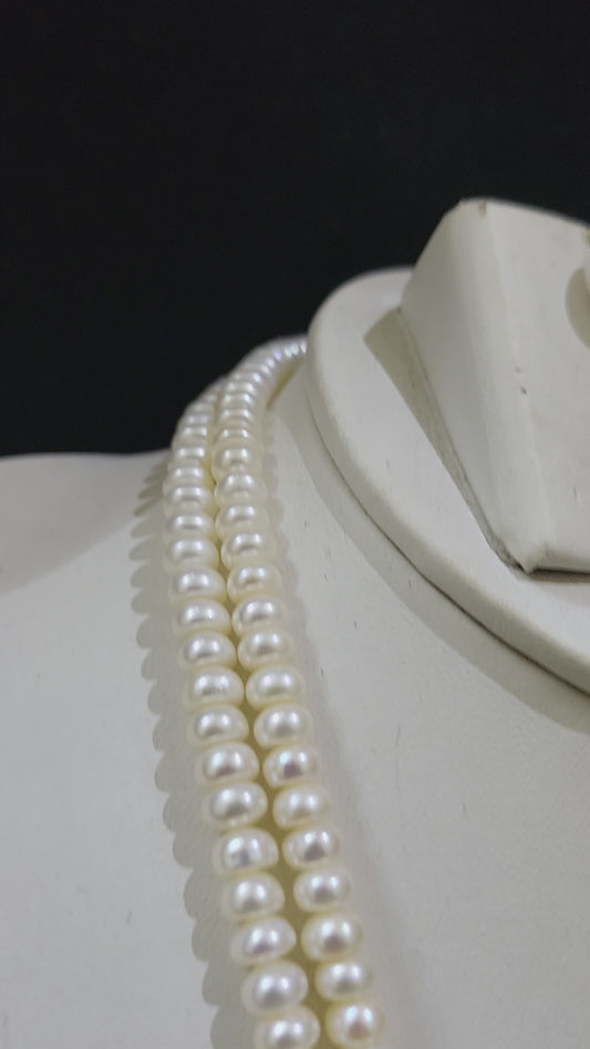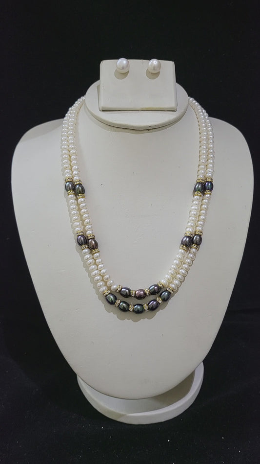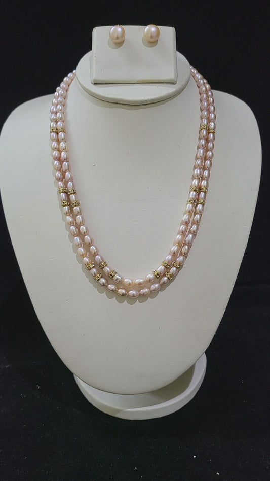 Double Freshwater Real Pearl Necklace with Oval Earrings