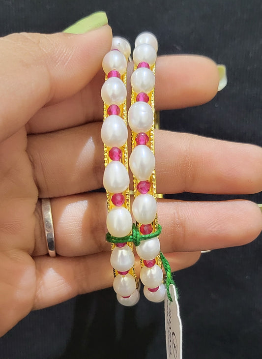 Set of 2 | Real Pearl Bangles White with Garnet Beads (Gold Alloy Base) | Sizes 2.2 to 2.10