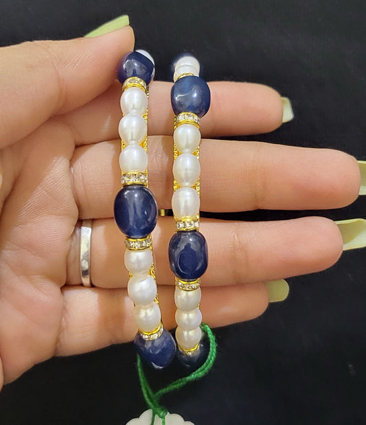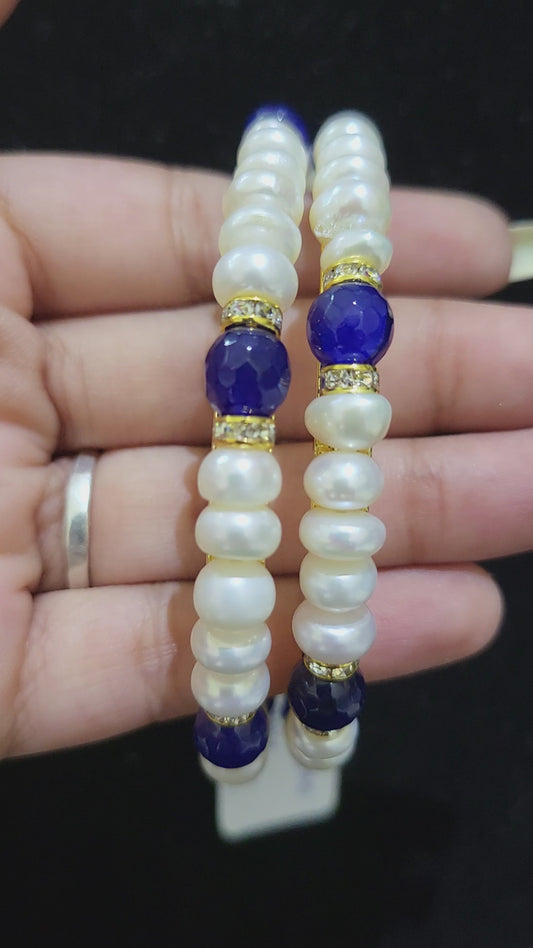 Set of 2 | Real Pearl Bangles with Blue Beads (Gold Alloy Base) | Sizes 2.2 to 2.10