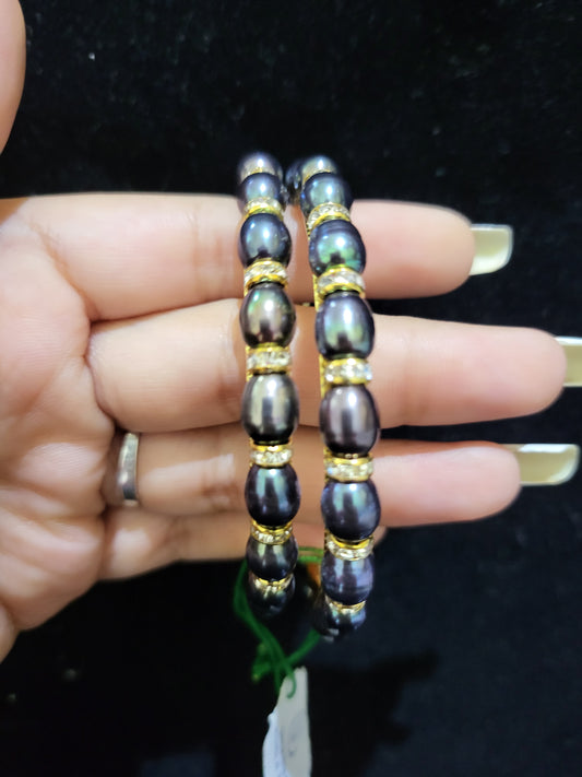 Set of 2 | Real Pearl Bangles with Black Beads (Gold Alloy Base) | Sizes 2.2 to 2.10