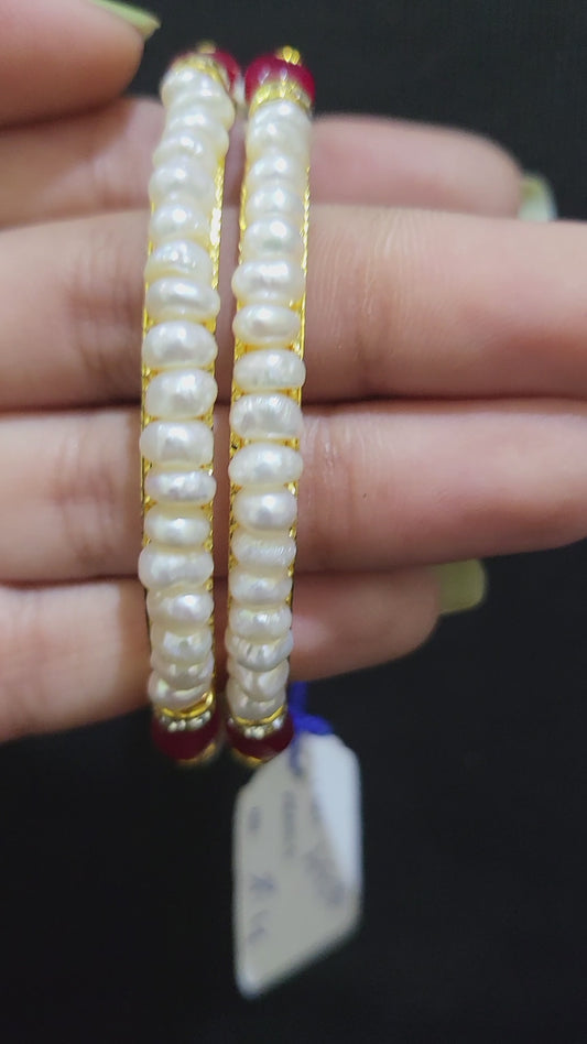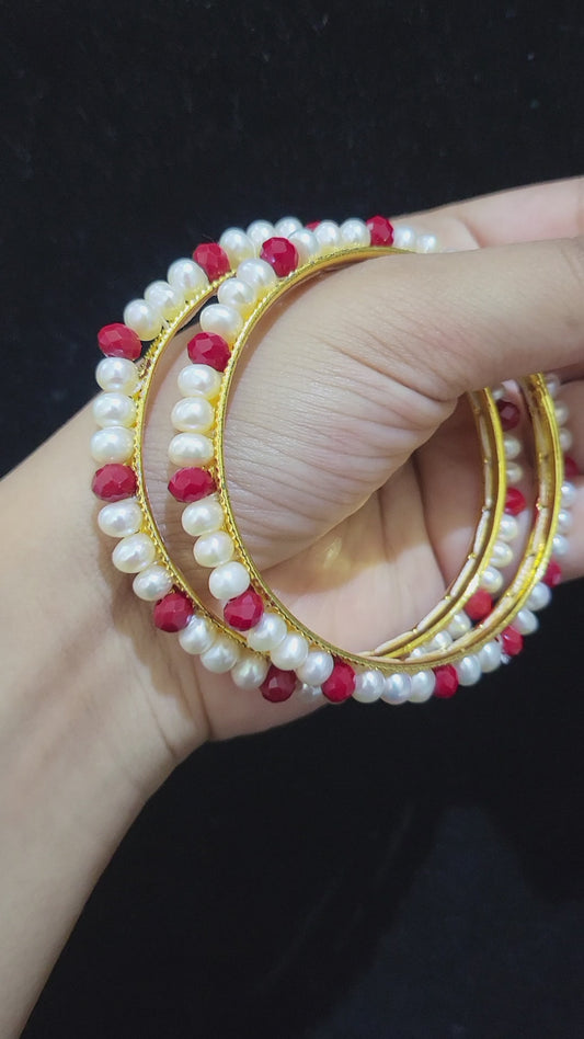 Set of 2 | Real Pearl Bangles with Red Beads (Gold Alloy Base) | Sizes 2.2 to 2.10