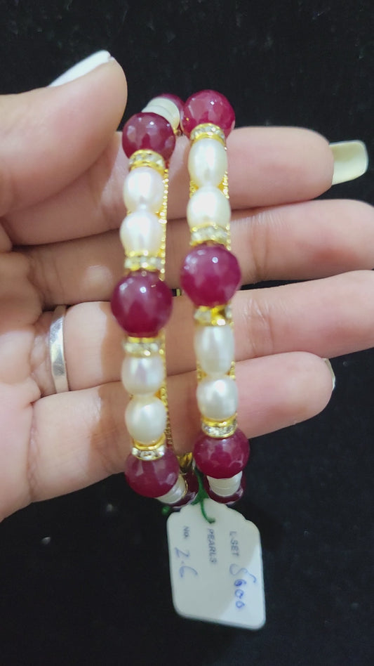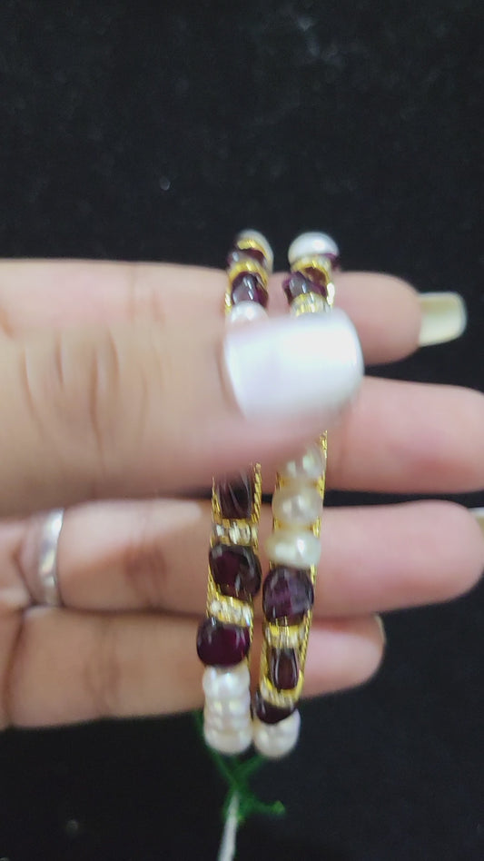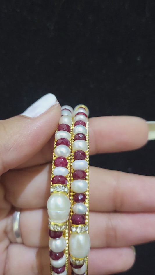 Set of 2 | Real Pearl Bangles with Maroon Beads (Gold Alloy Base) | Sizes 2.2 to 2.10