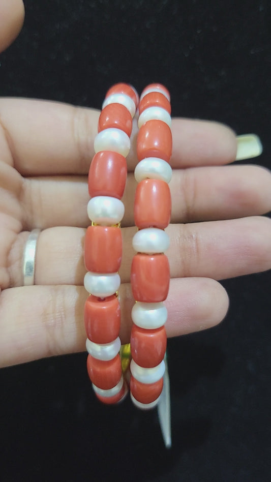Set of 2 | Real Pearl Bangles with Coral Beads (Gold Alloy Base) | Sizes 2.2 to 2.10