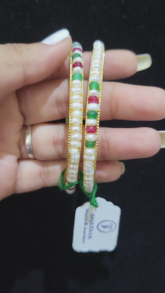 Set of 2 | Real Pearl Bangles with Red & Green Beads (Gold Alloy Base) | Sizes 2.2 to 2.10