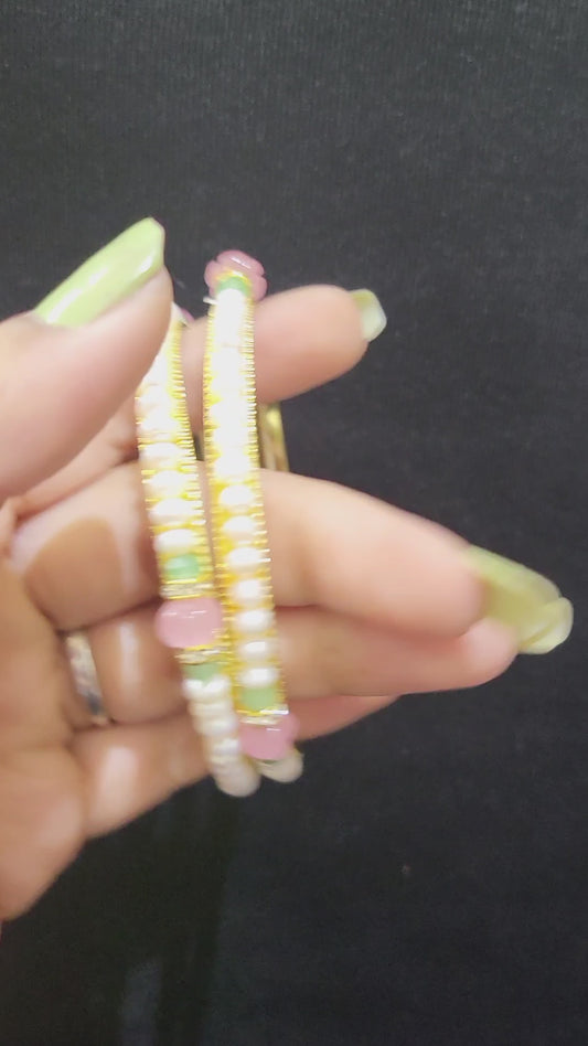 Set of 2 | Real Pearl Bangles White with Green Beads (Gold Alloy Base) | Sizes 2.2 to 2.10