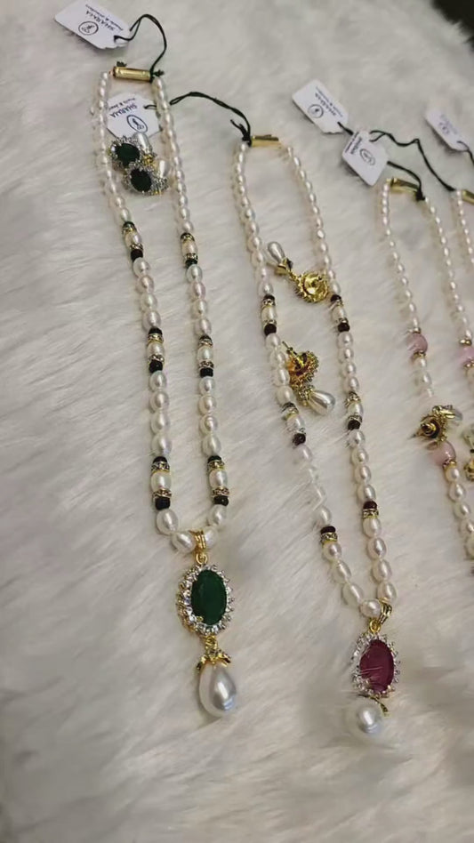 Emerald Freshwater Real Pearls Necklace | With Emerald and CZ Pendant