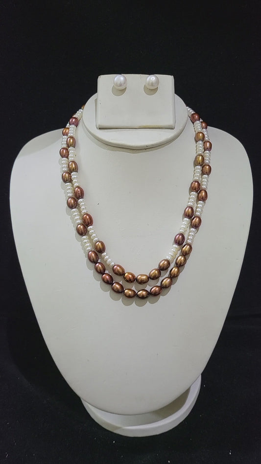 Double Layer Real Pearls Necklace | White & Brown Pearls