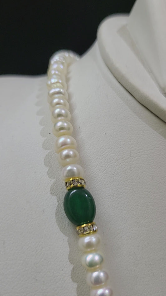 Single Layer Real Pearls Necklace | White pearls & green onax oval beads