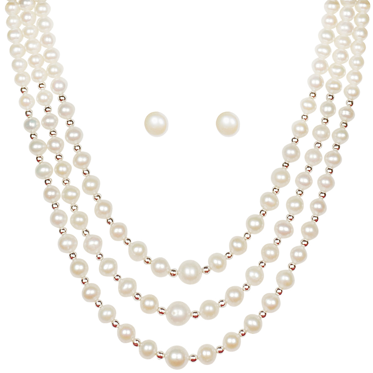 Premium Triple Layer Freshwater Real Pearl Necklace with Long Earrings