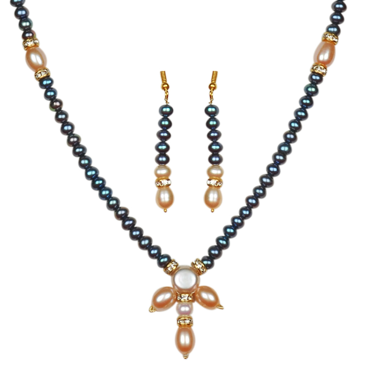 Add effortless elegance to your look with this breathtaking black real pearl necklace and long earrings set. The classic black pearls make a beautiful statement and the long earrings add a graceful touch of timeless grace to any outfit. Perfect for special occasions or everyday wear!