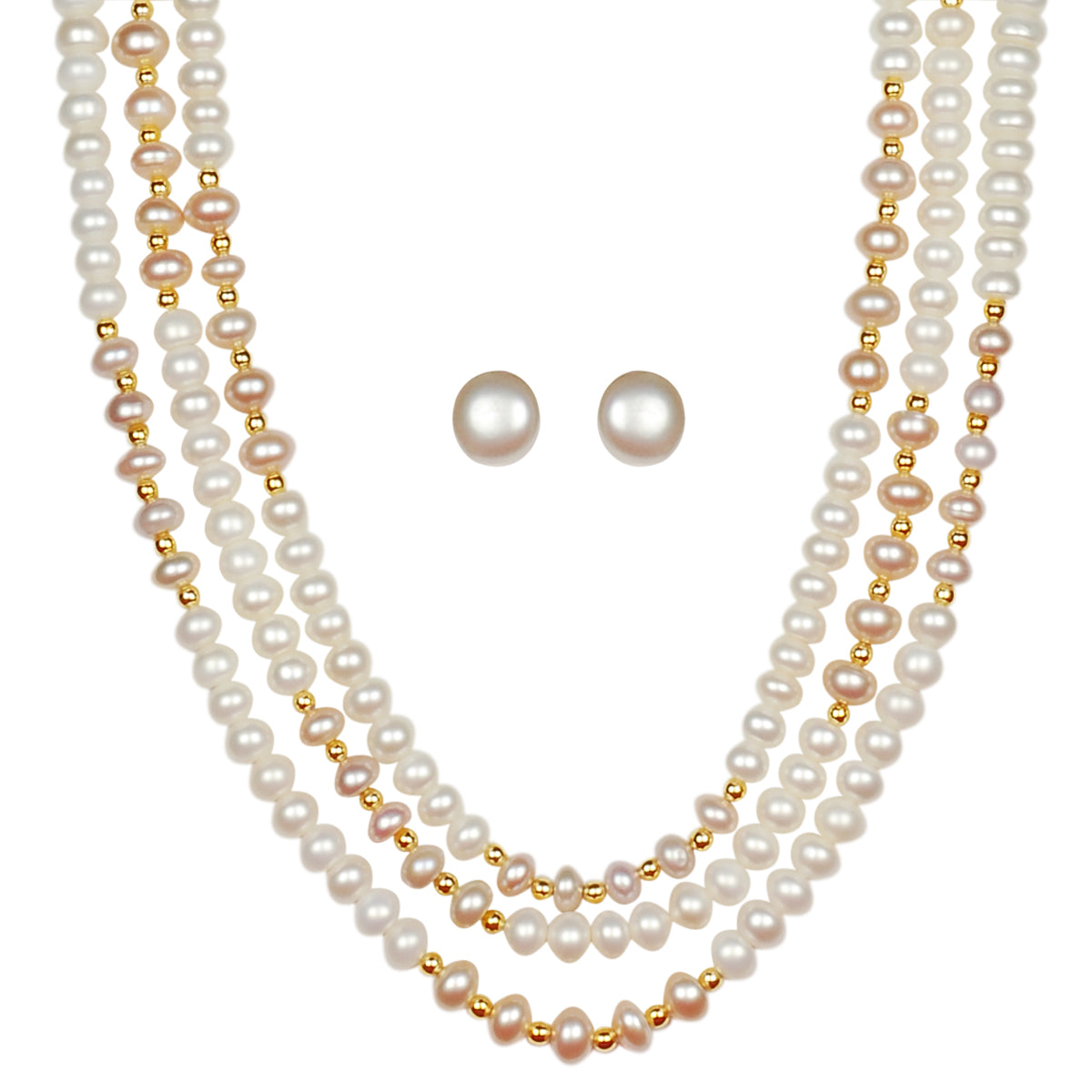 Triple Layer Freshwater Real Pearl Necklace with Stud Earrings
