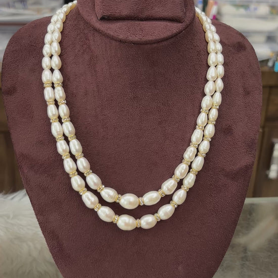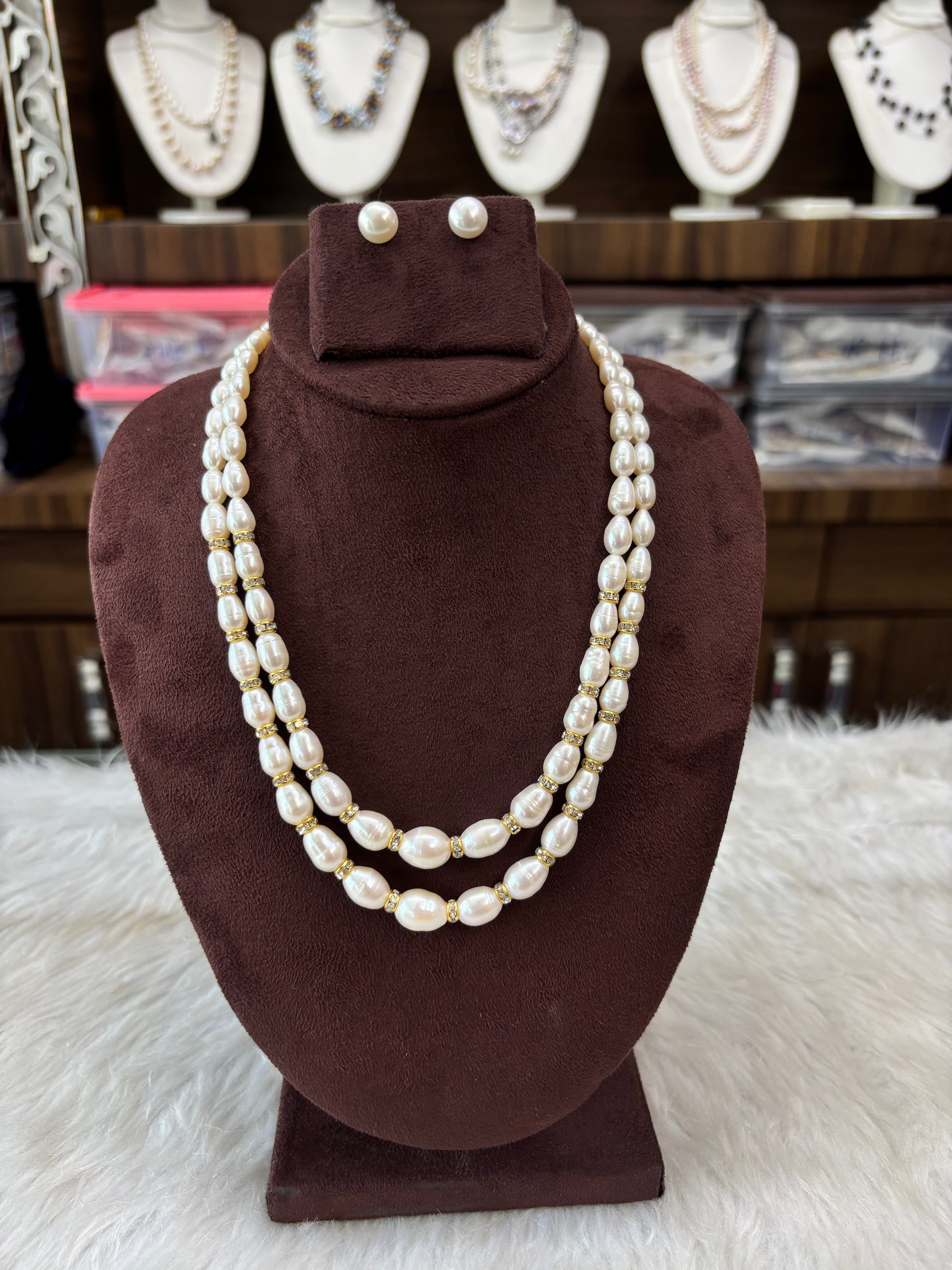 A sophisticated double-layer pearl necklace set featuring lustrous pearls and delicate gold-tone spacers. Paired with matching pearl stud earrings, this set is perfect for daily wear, parties, and traditional occasions.