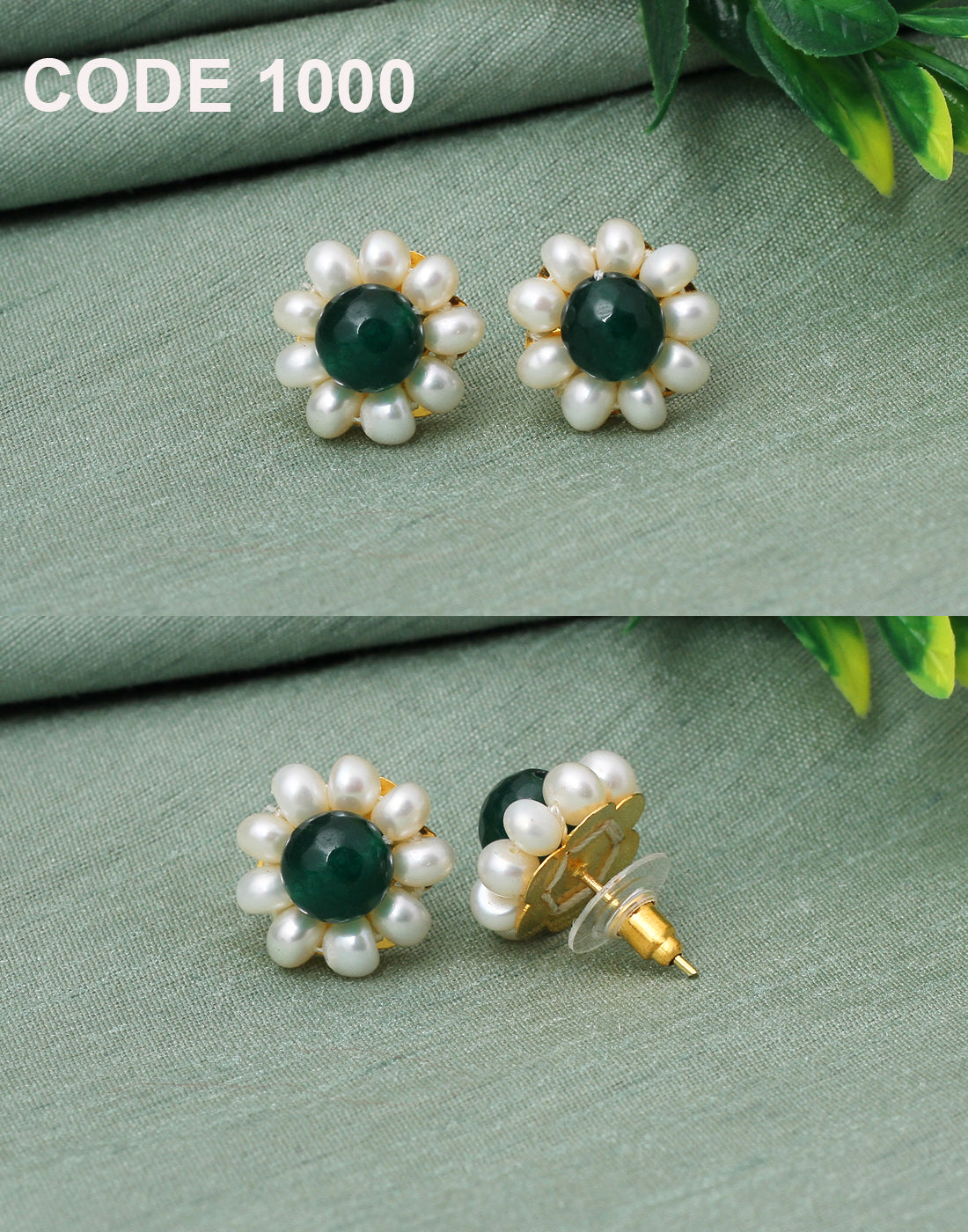Green Flower Freshwater Pearl Stud Earrings