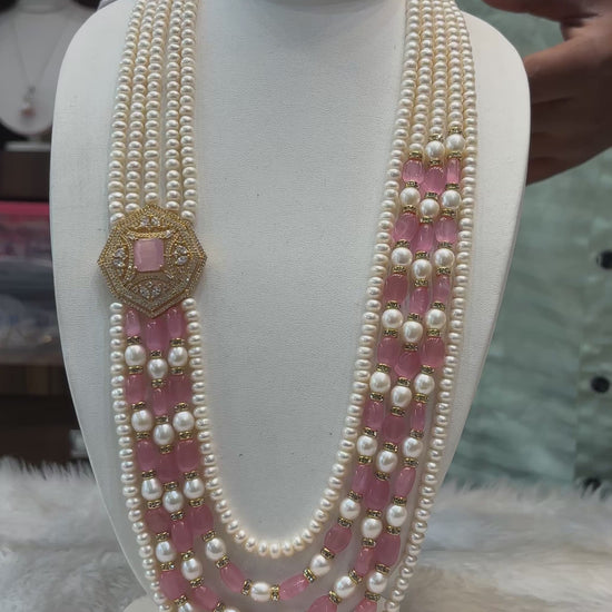 โจ Elevate your elegance with this stunning 4-layer Pearl Necklace Set, beautifully accented with soft pink stones and Kundan detailing.