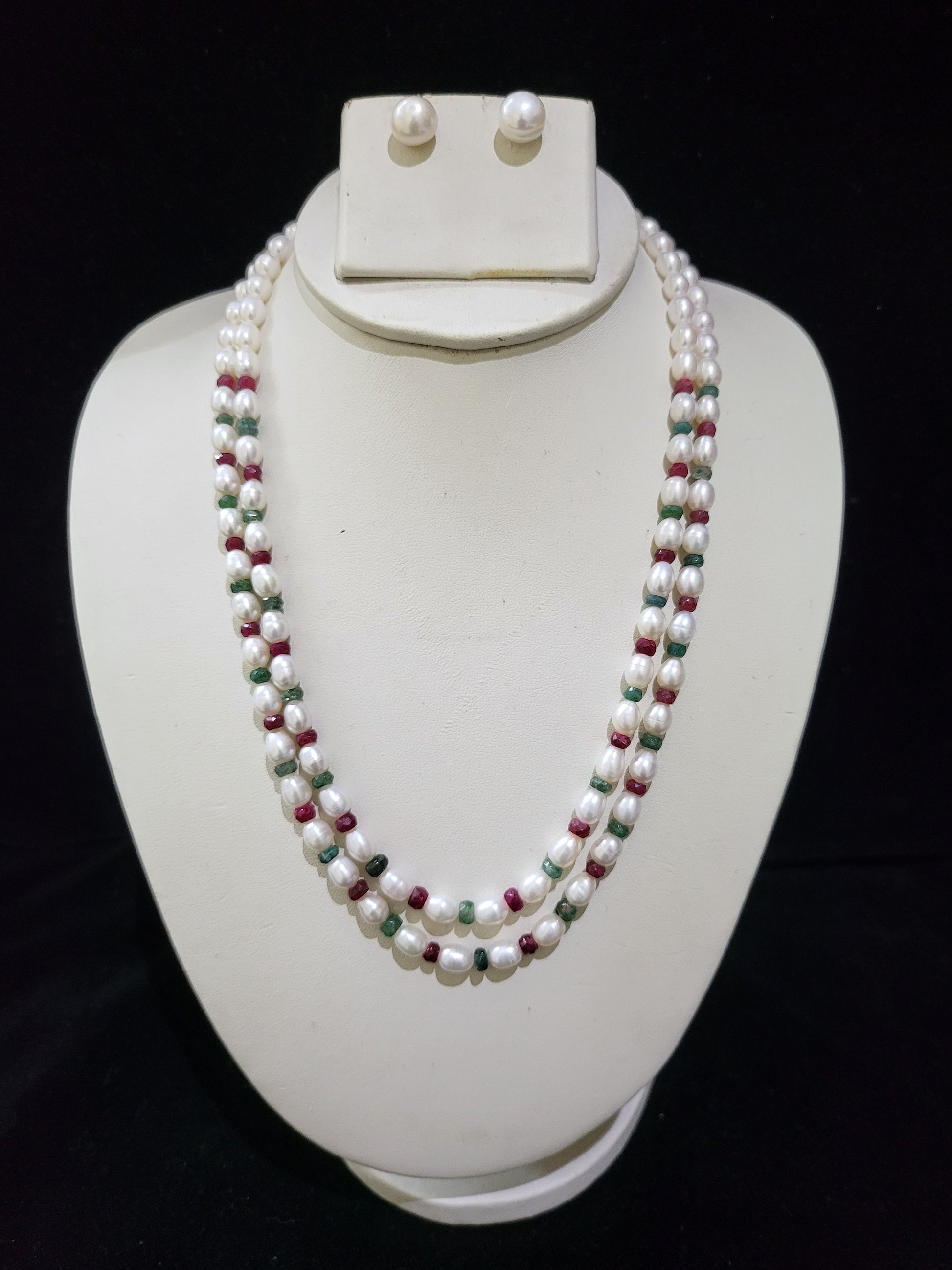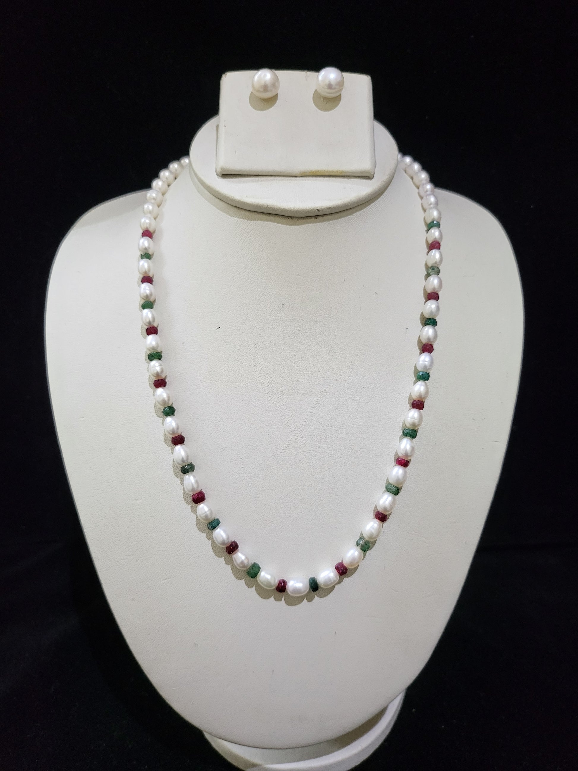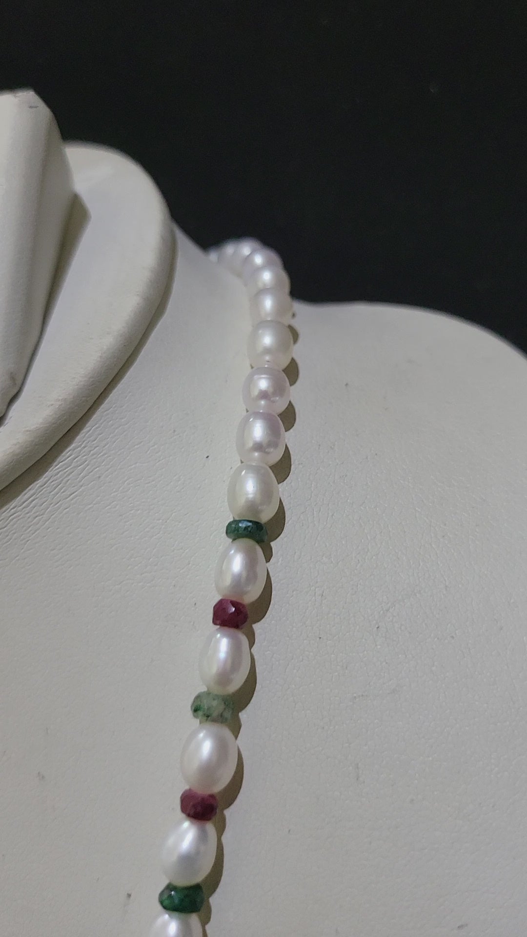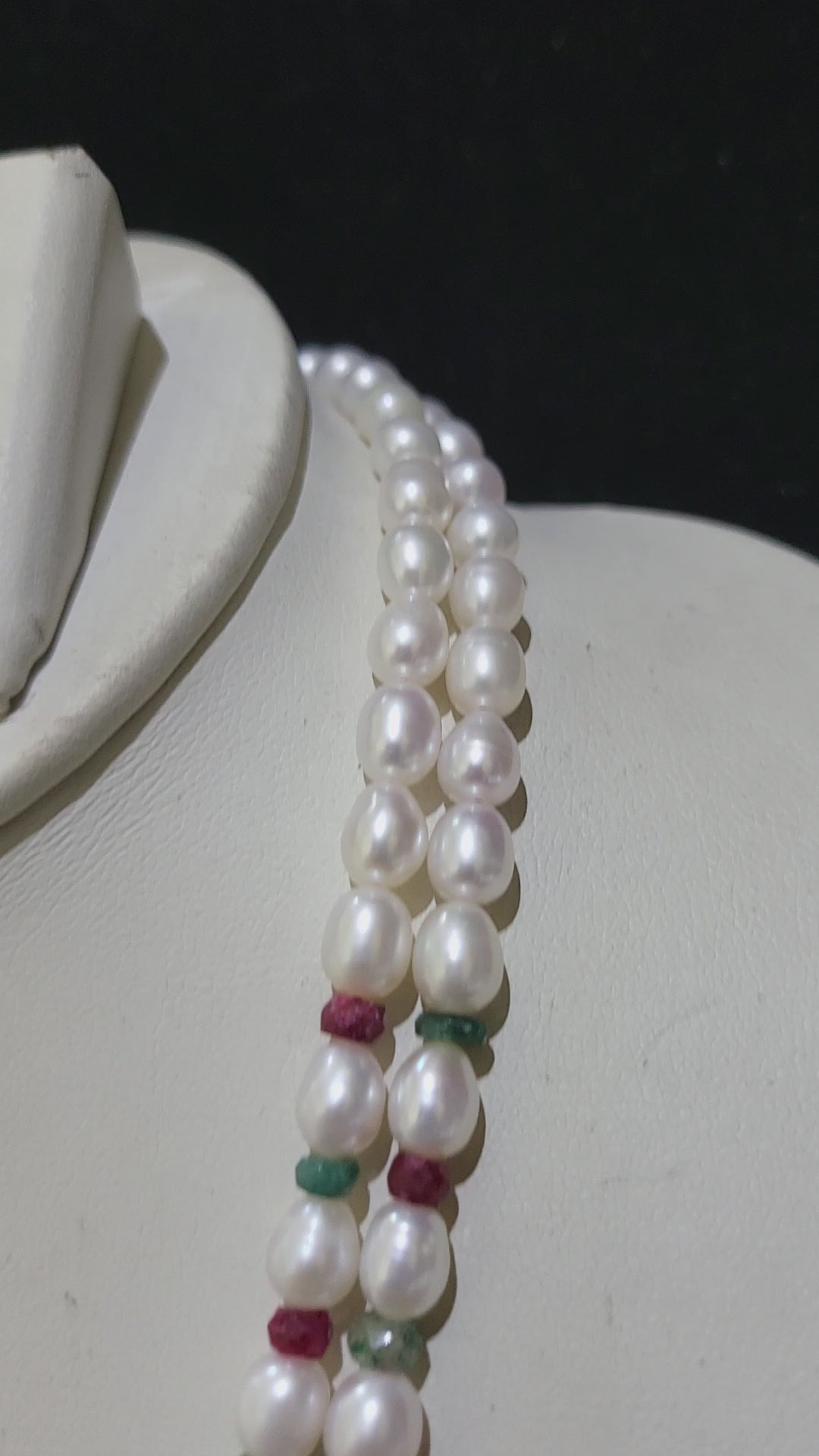 Premium Real Pearls Necklace | White Pearls & Red-Green Beads
