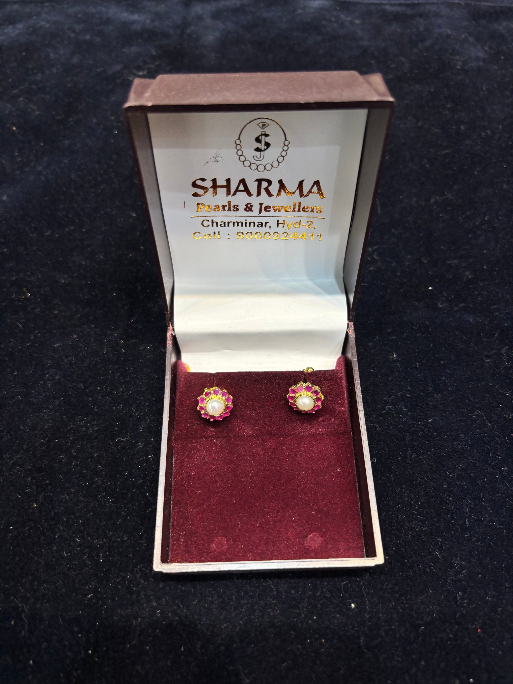 Crafted by Sharma Pearls & Jewellers, Charminar, they feature a luminous pearl at the center surrounded by vibrant pink stones that add a royal touch to any outfit.