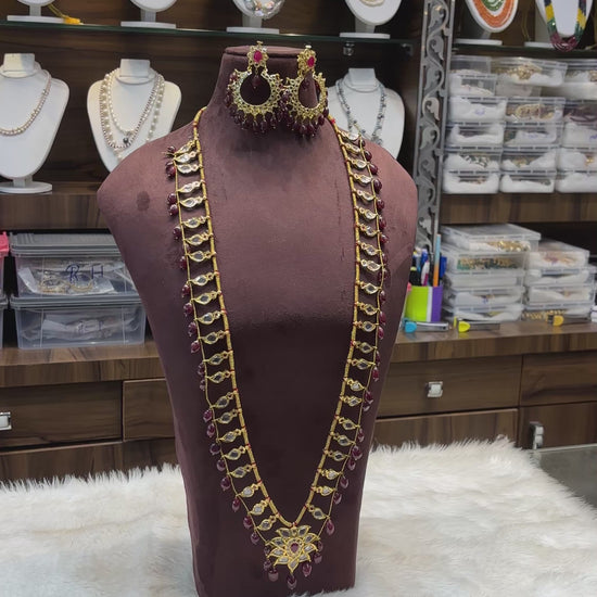 A stunning handcrafted ruby pearl kundan necklace set paired with matching earrings. Perfect for weddings, festive occasions, and grand celebrations. Designed with intricate detailing to bring timeless elegance and luxury to your jewellery collection.