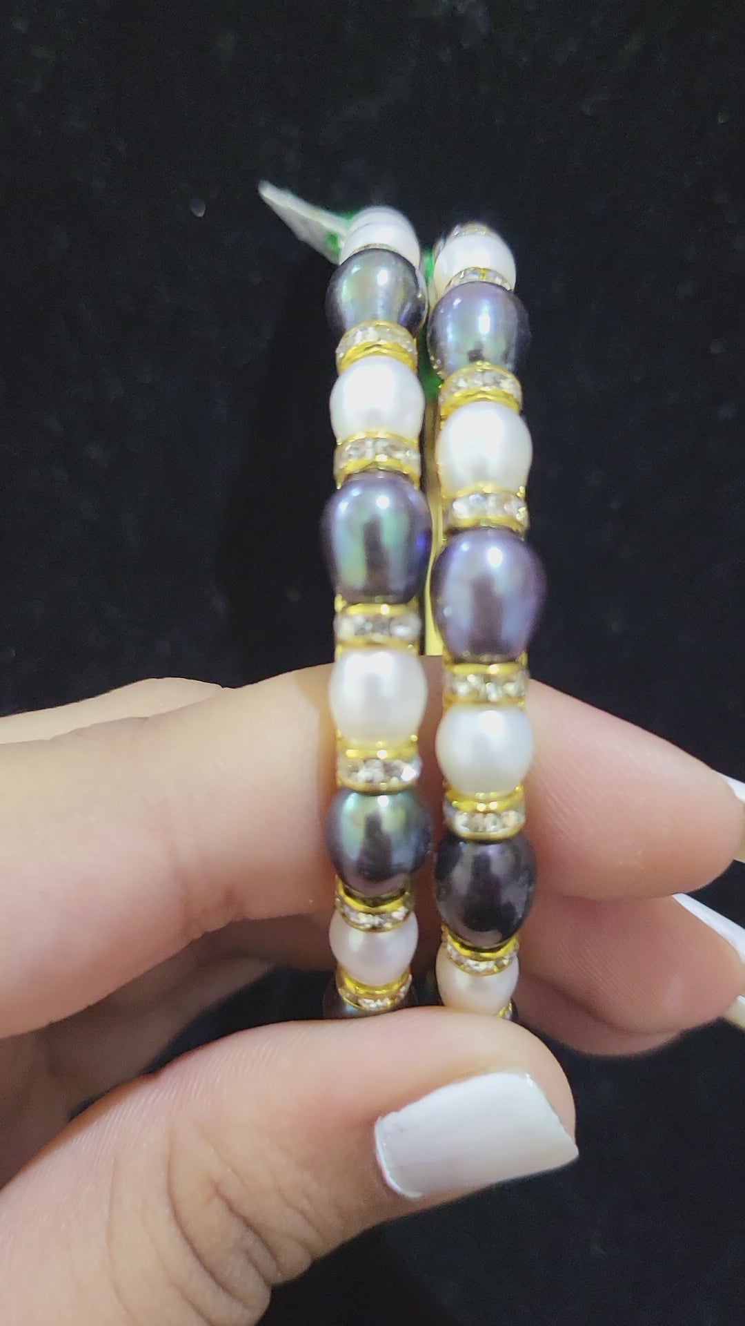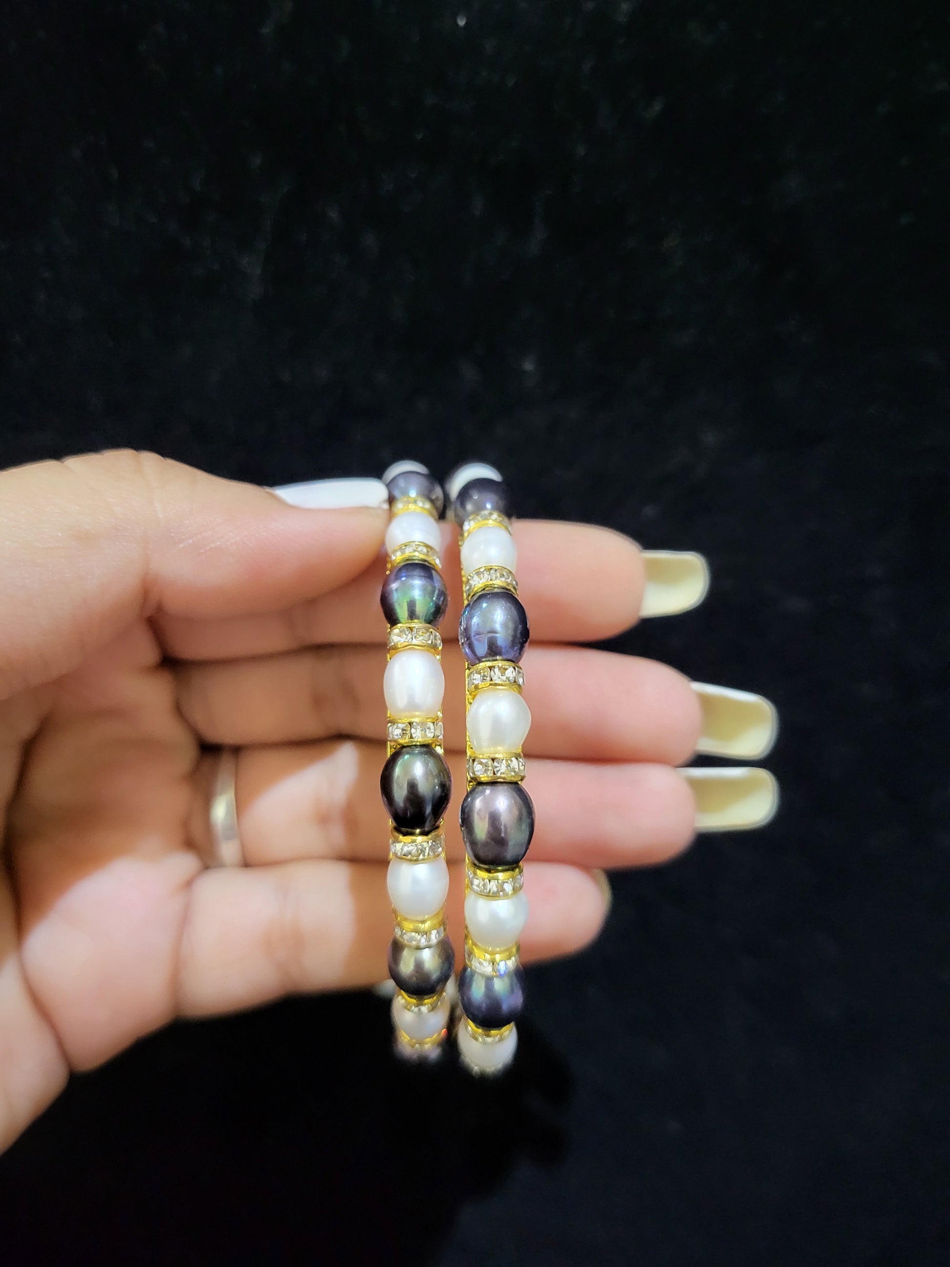 Set of 2 | Real Pearl Bangles | Black & White Pearls (Gold Alloy Base) | Sizes 2.2 to 2.10
