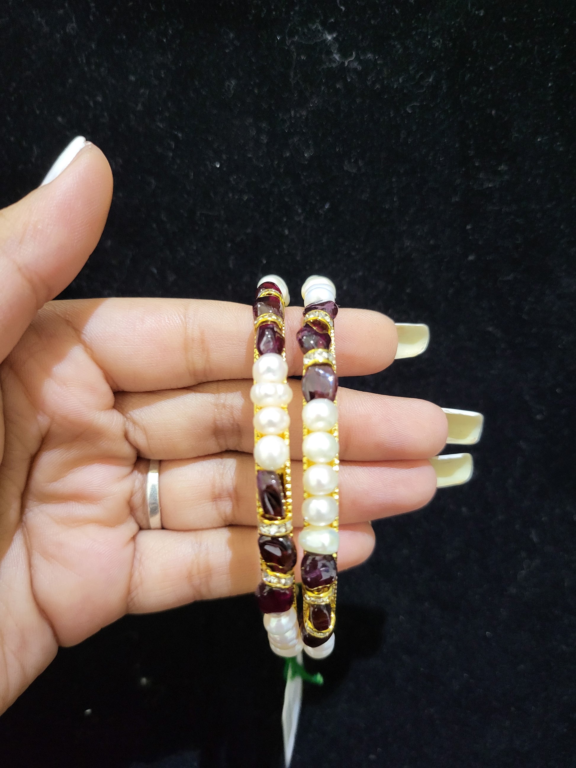 Set of 2 | Real Pearl Bangles White with Garnet Beads (Gold Alloy Base) | Sizes 2.2 to 2.10