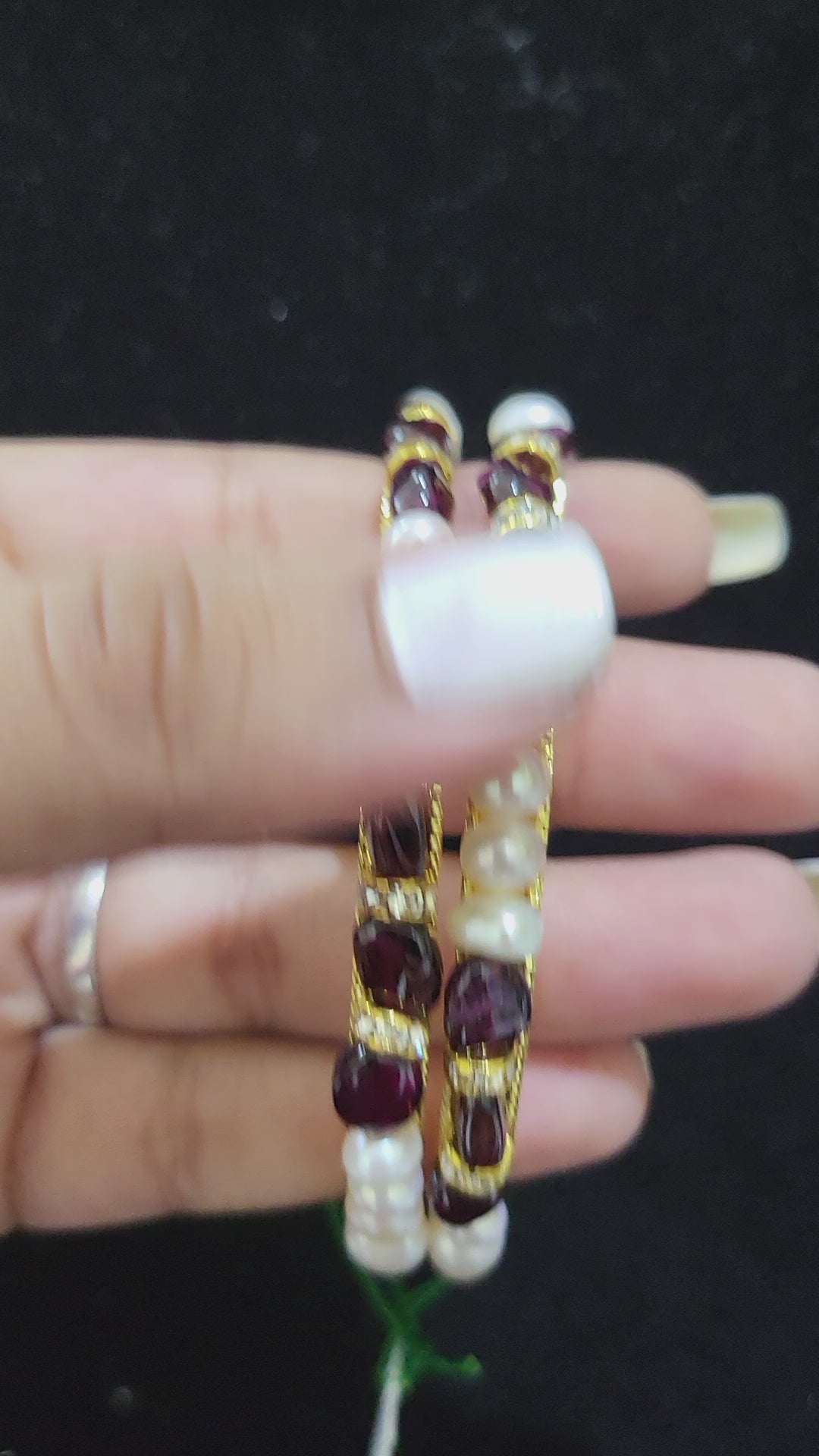 Elevate any outfit with our set of 2 real pearl bangles, featuring stunning garnet bead accents on a gold alloy base. Available in sizes 2.2 to 2.10, these bangles add a touch of luxury and sophistication to any wardrobe. Make a statement and feel effortlessly beautiful with our bangle set.