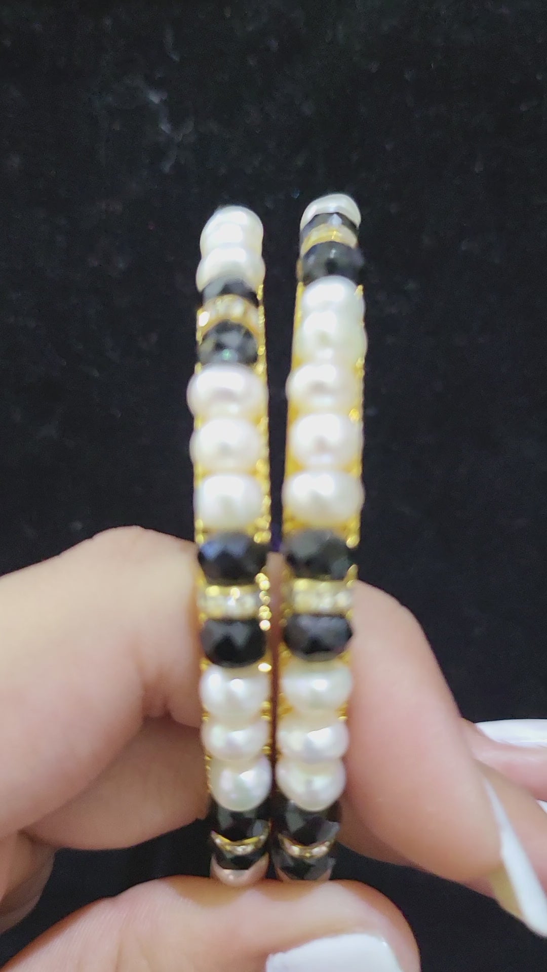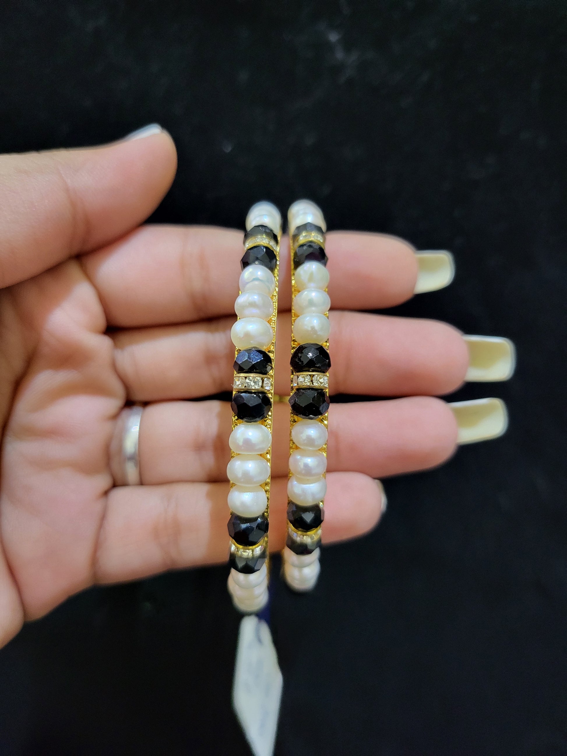 Set of 2 | Real Pearl Bangles with Black Beads (Gold Alloy Base) | Sizes 2.2 to 2.10
