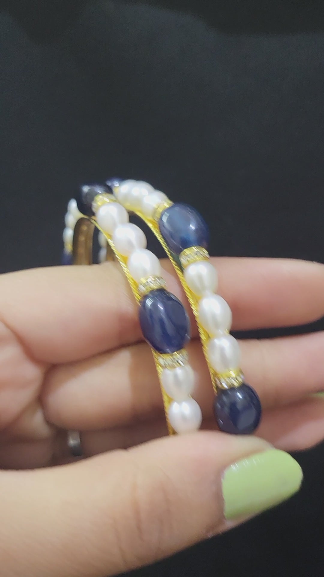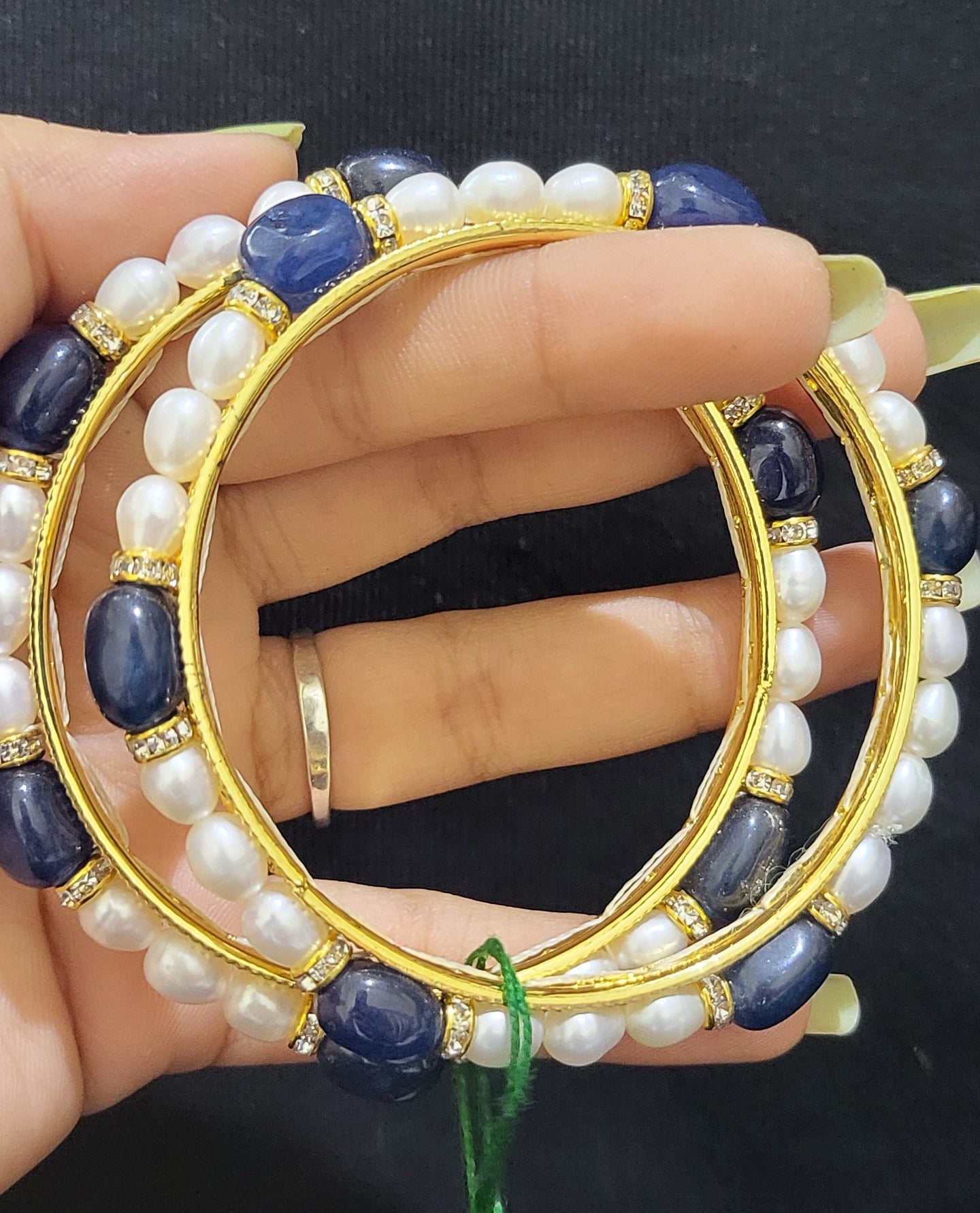 Set of 2 | Real Pearl Bangles with Gold Alloy Base (Blue Beads) | Sizes 2.2 to 2.10