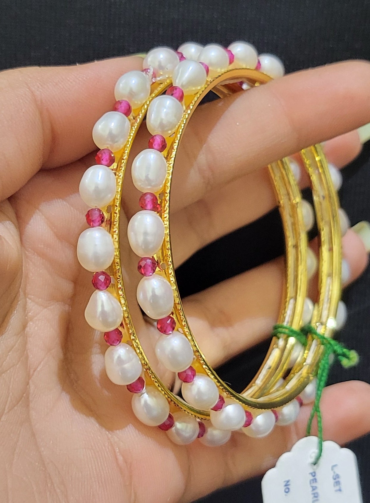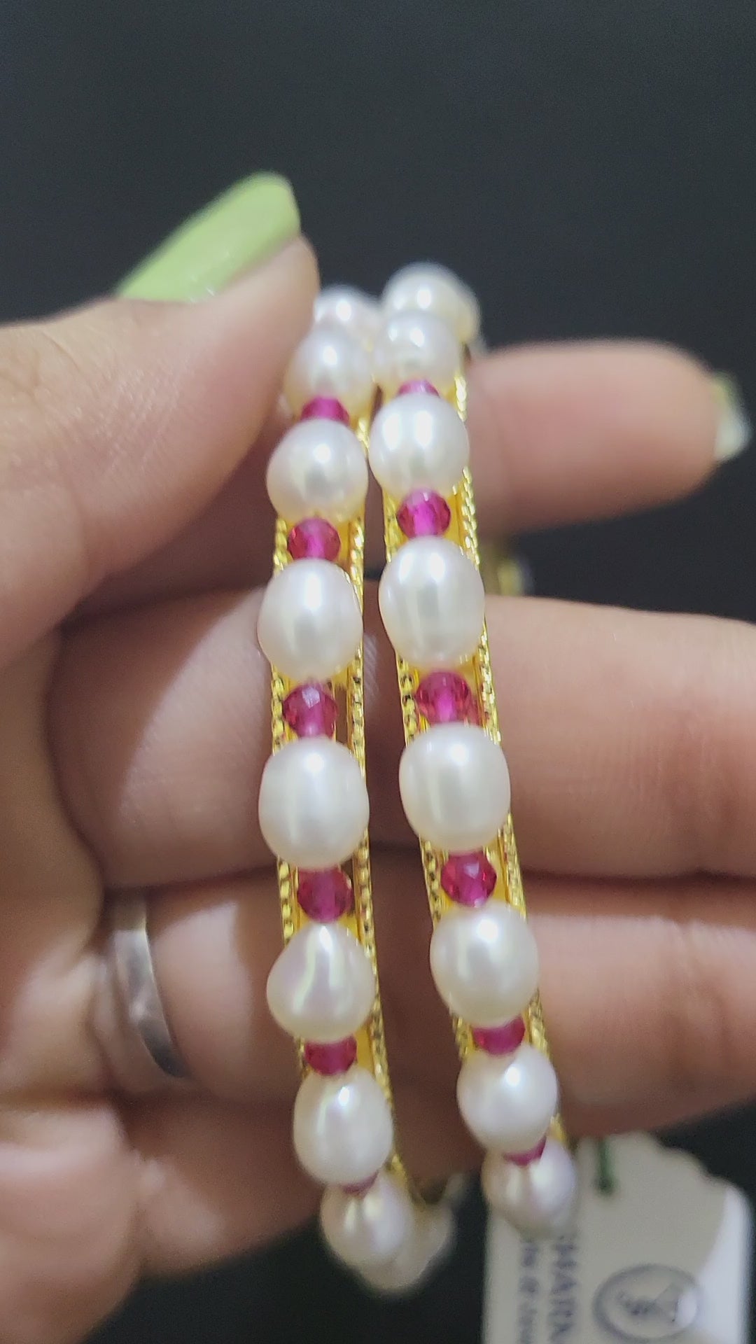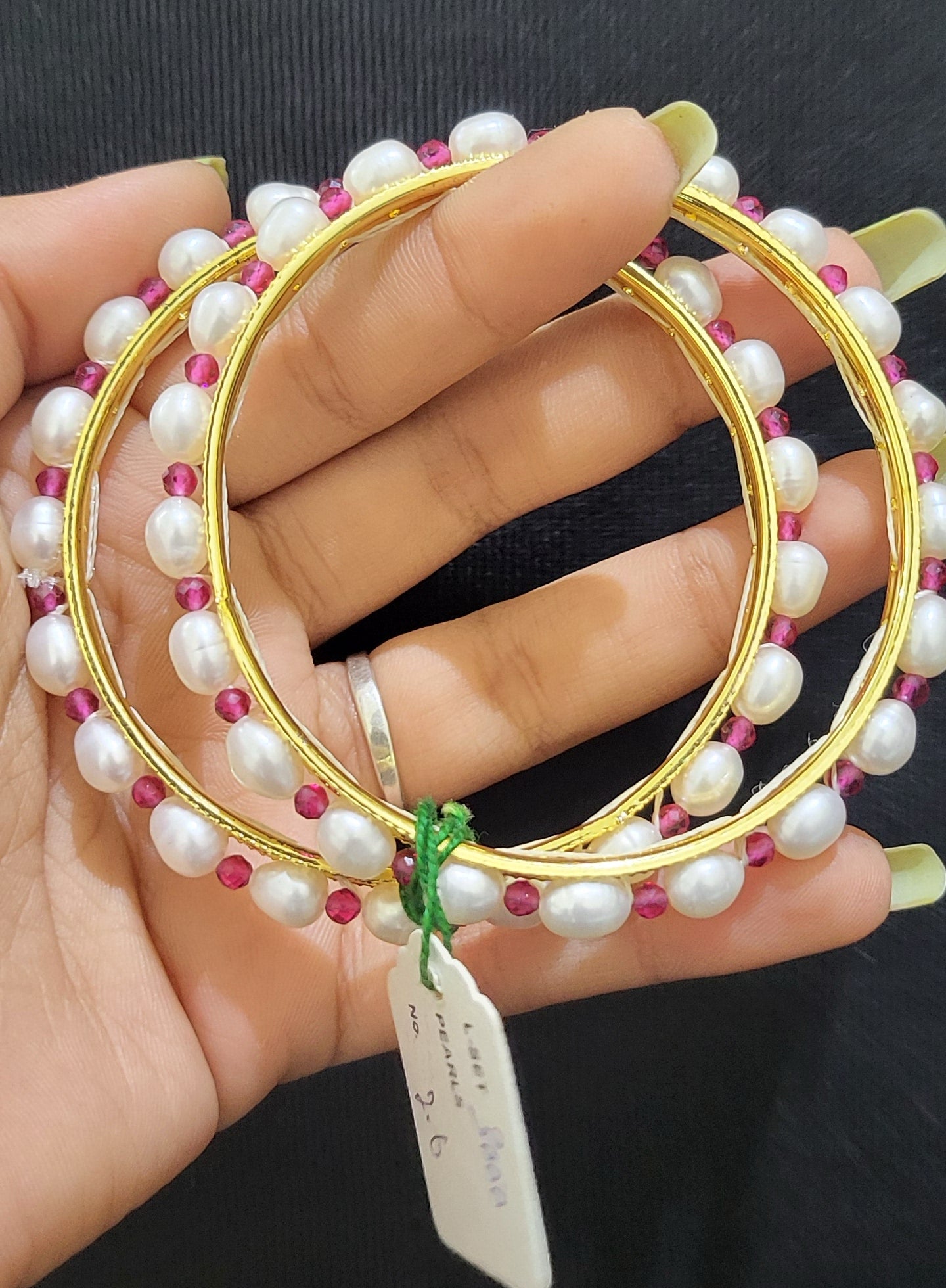 Elevate your style with this stunning set of 2 real pearl bangles with a luxurious gold alloy base. Available in sizes 2.2 to 2.10, these bangles add a touch of elegance and sophistication to any outfit. Bring out your inner glamour with this must-have accessory!