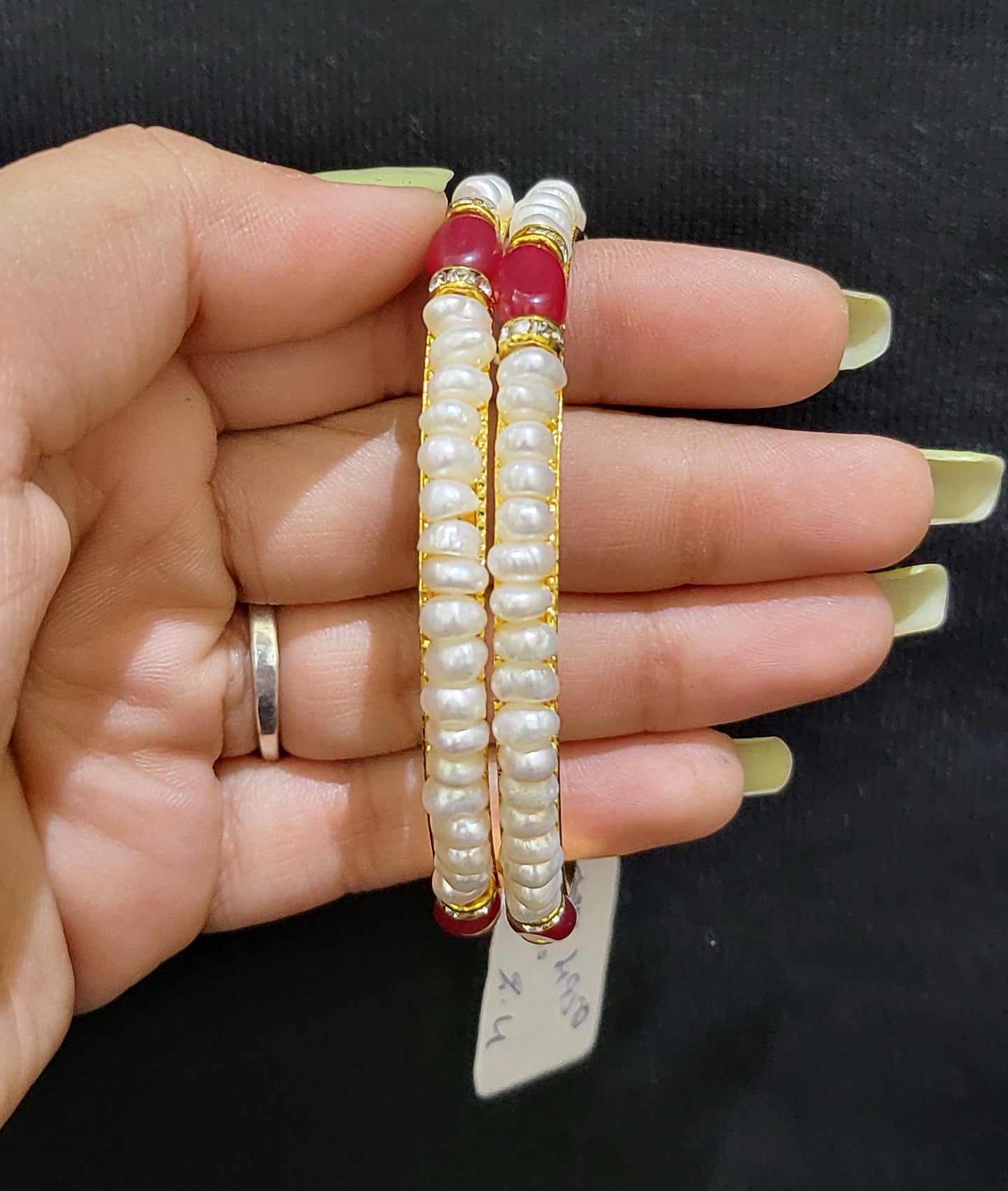 Elevate your style with this stunning set of 2 real pearl bangles with a luxurious gold alloy base in a vibrant red hue. Available in sizes 2.2 to 2.10, these bangles add a touch of elegance and sophistication to any outfit. Bring out your inner glamour with this must-have accessory!