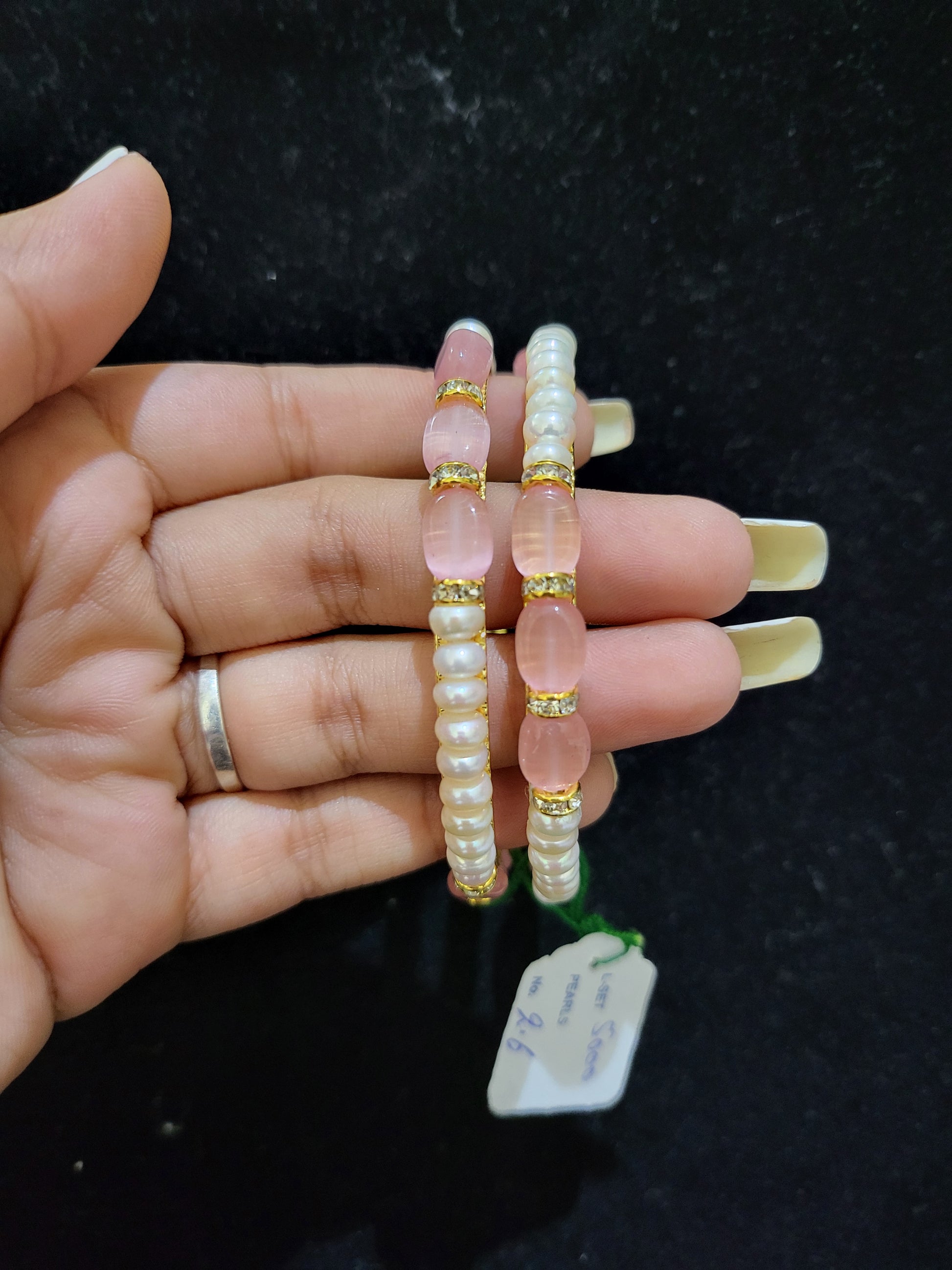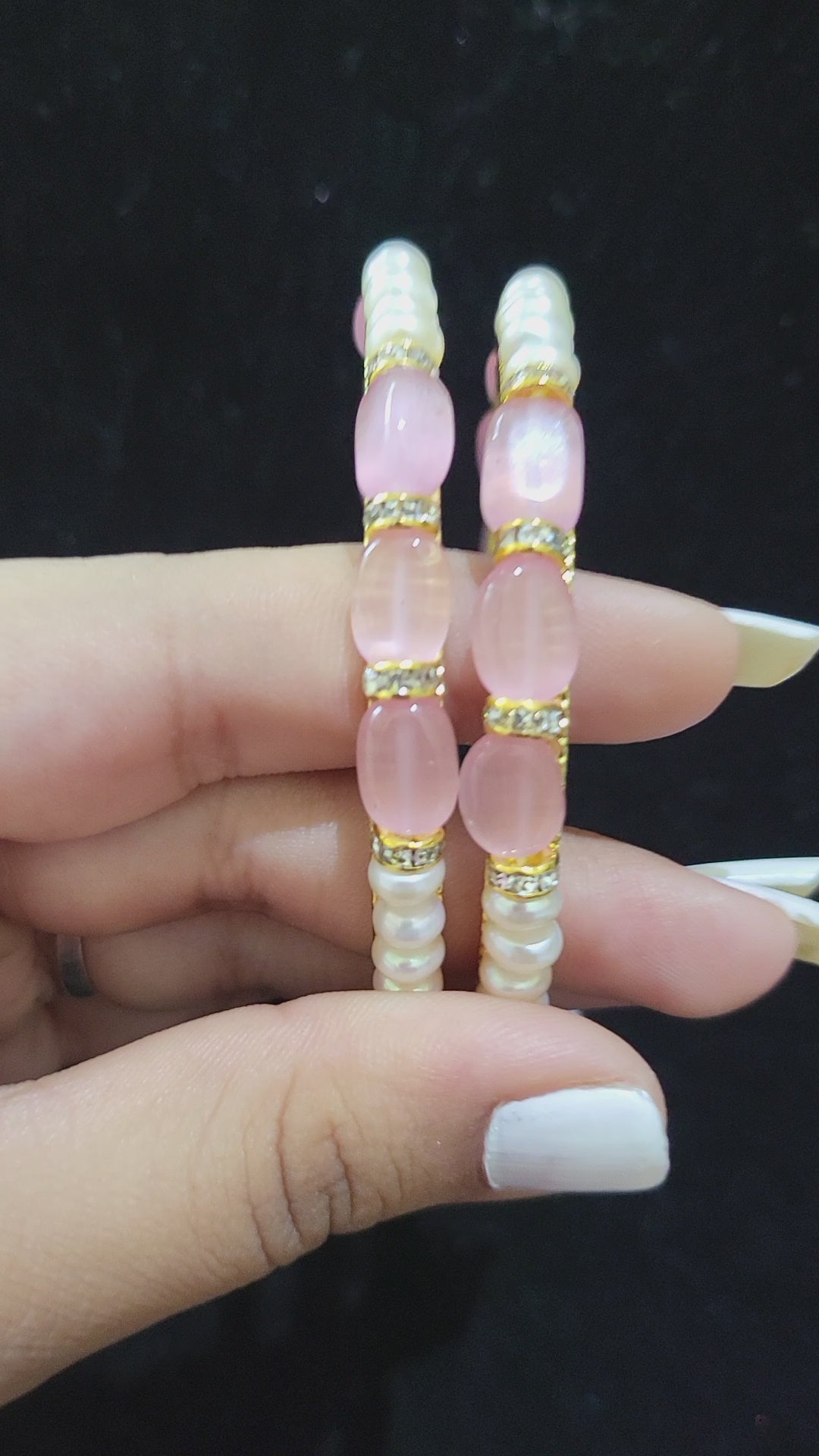 Set of 2 | Real Pearl Bangles with Pink Beads (Gold Alloy Base) | Sizes 2.2 to 2.10