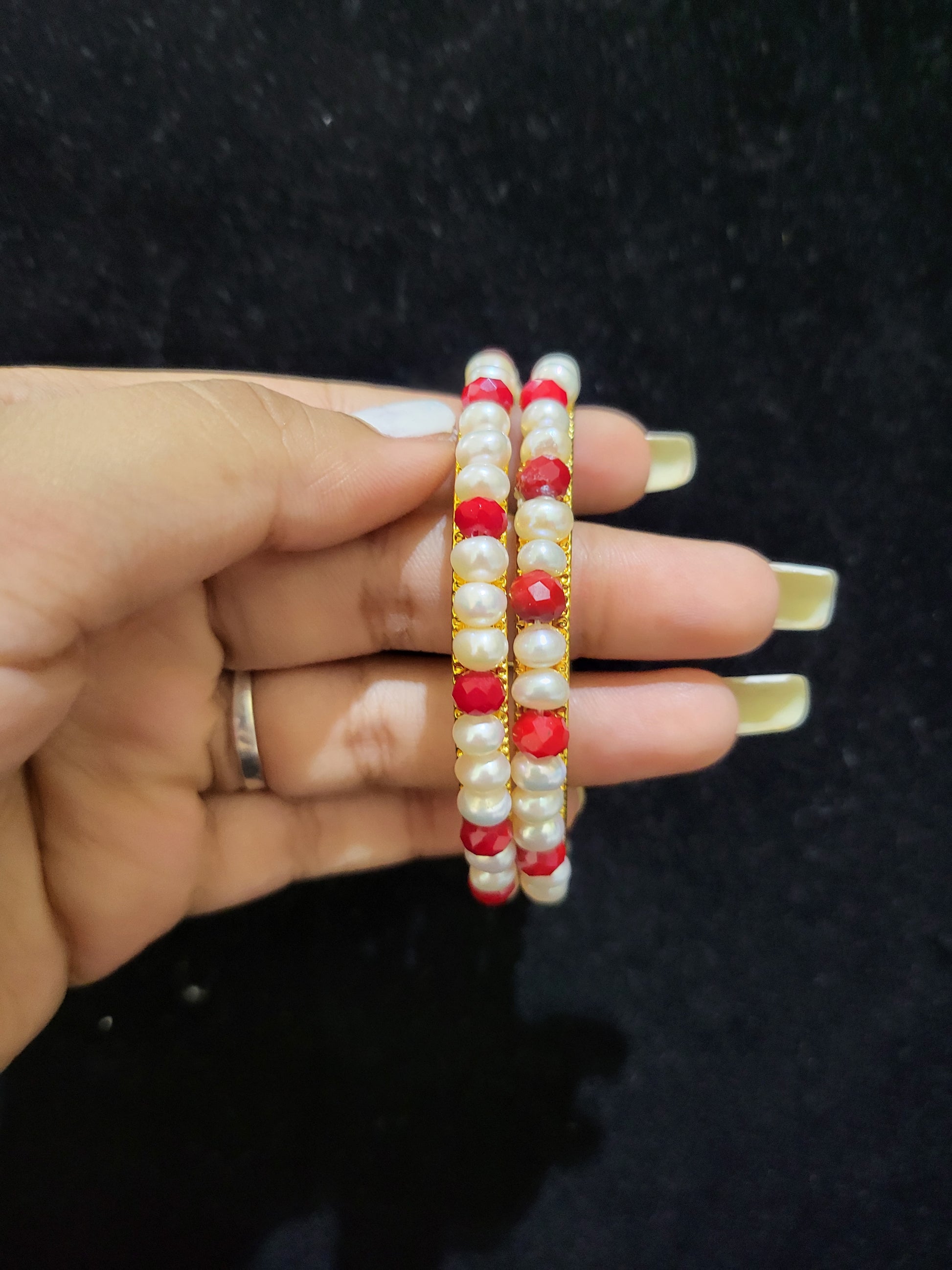 Set of 2 | Real Pearl Bangles with Red Beads (Gold Alloy Base) | Sizes 2.2 to 2.10