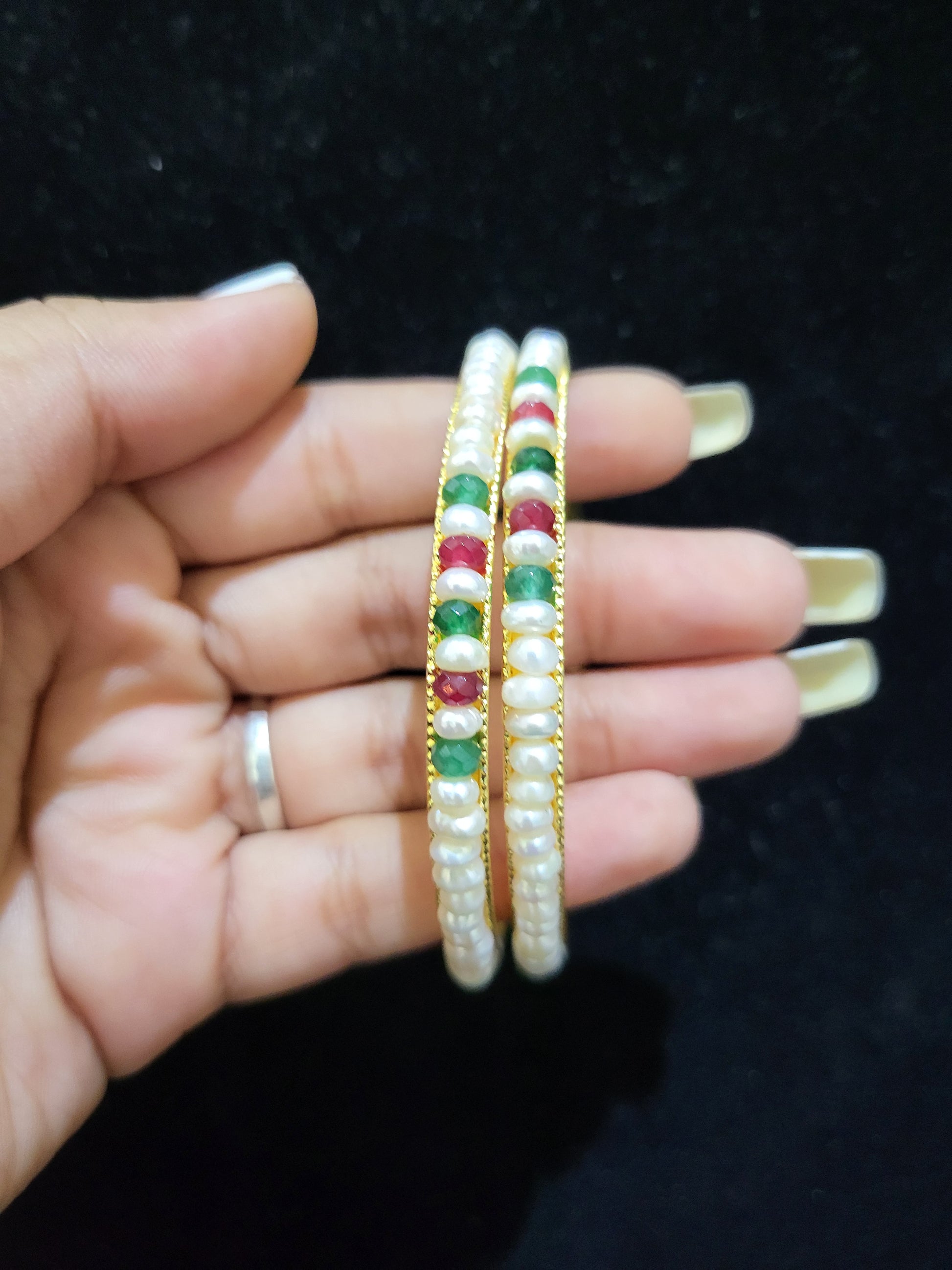 Set of 2 | Real Pearl Bangles with Red & Green Beads (Gold Alloy Base) | Sizes 2.2 to 2.10