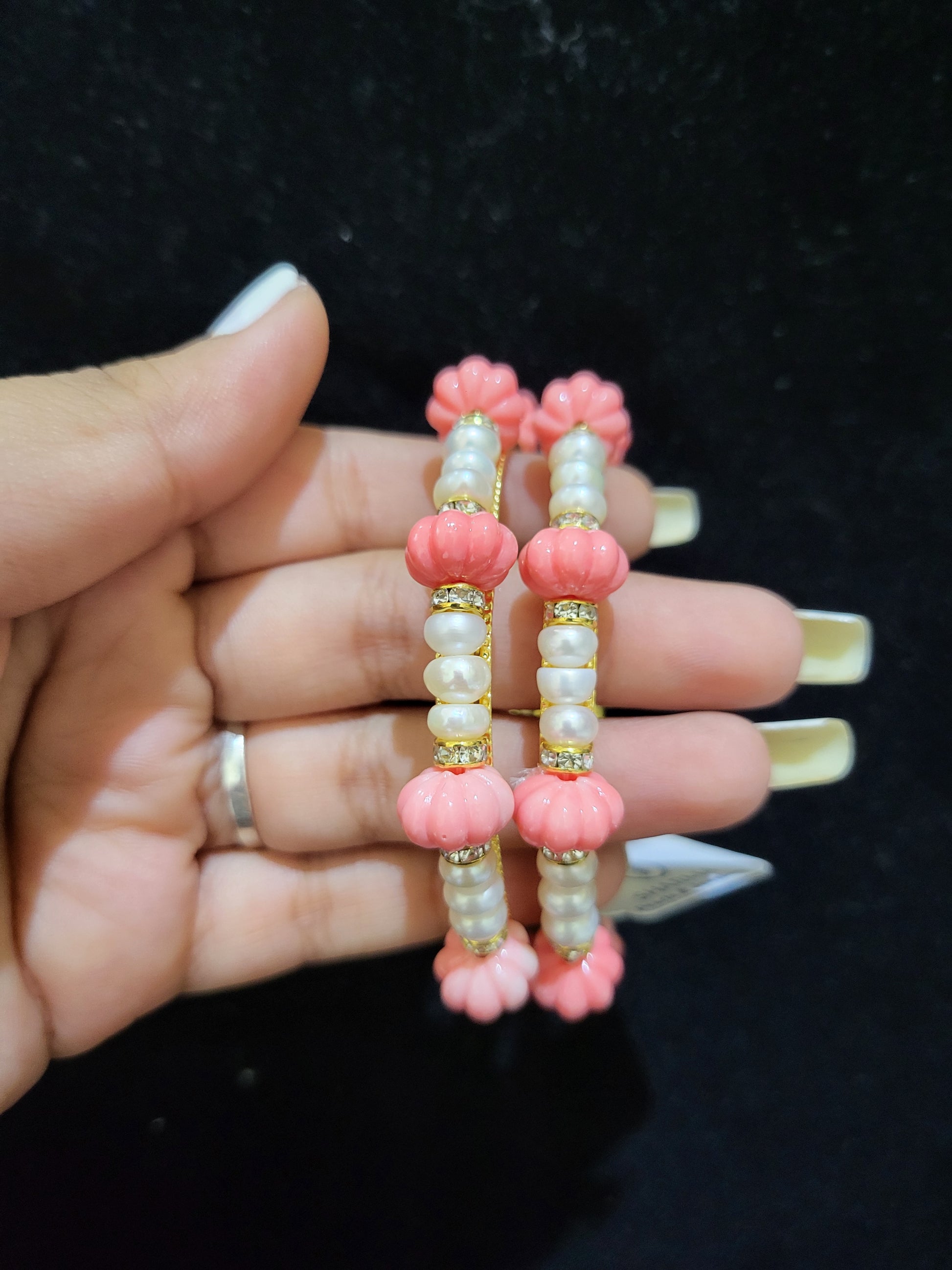 Set of 2 | Real Pearl Bangles with Pumpkin Pink Beads (Gold Alloy Base) | Sizes 2.2 to 2.10