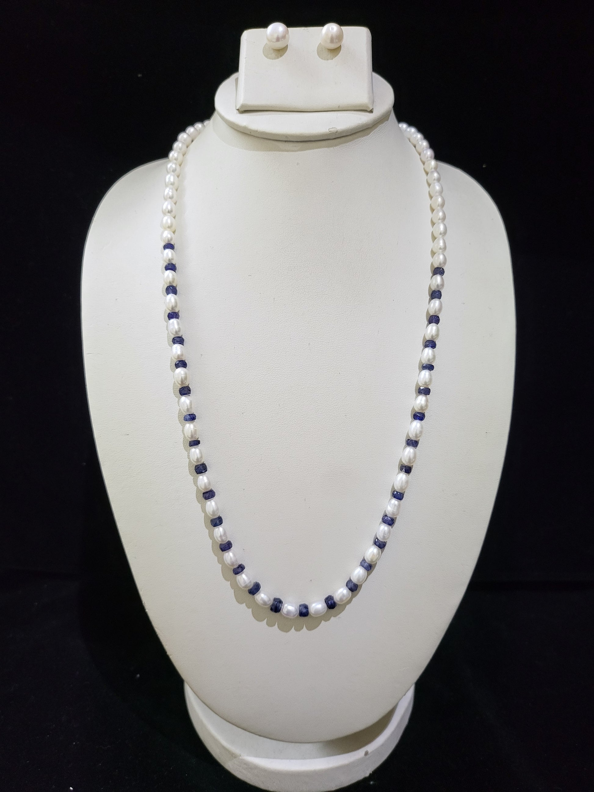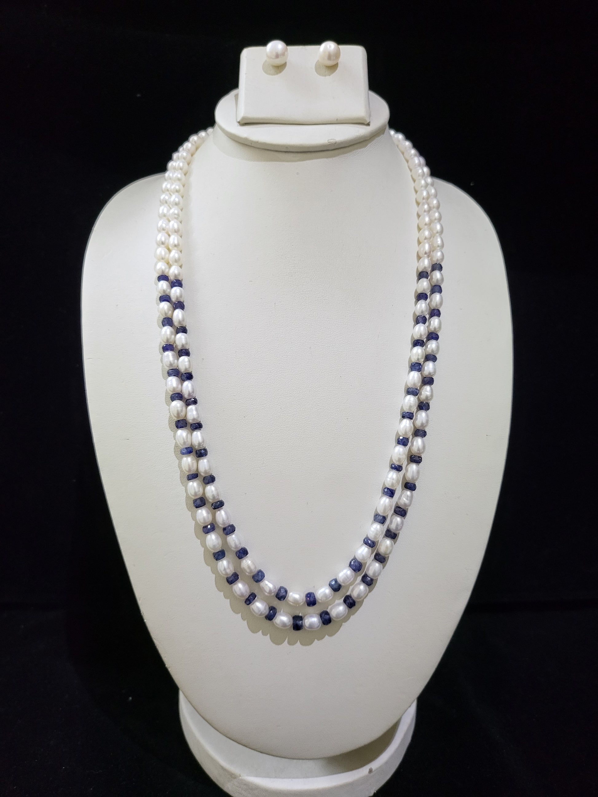 Real Pearls Necklace | White pearls with blue sapphire cut beads
