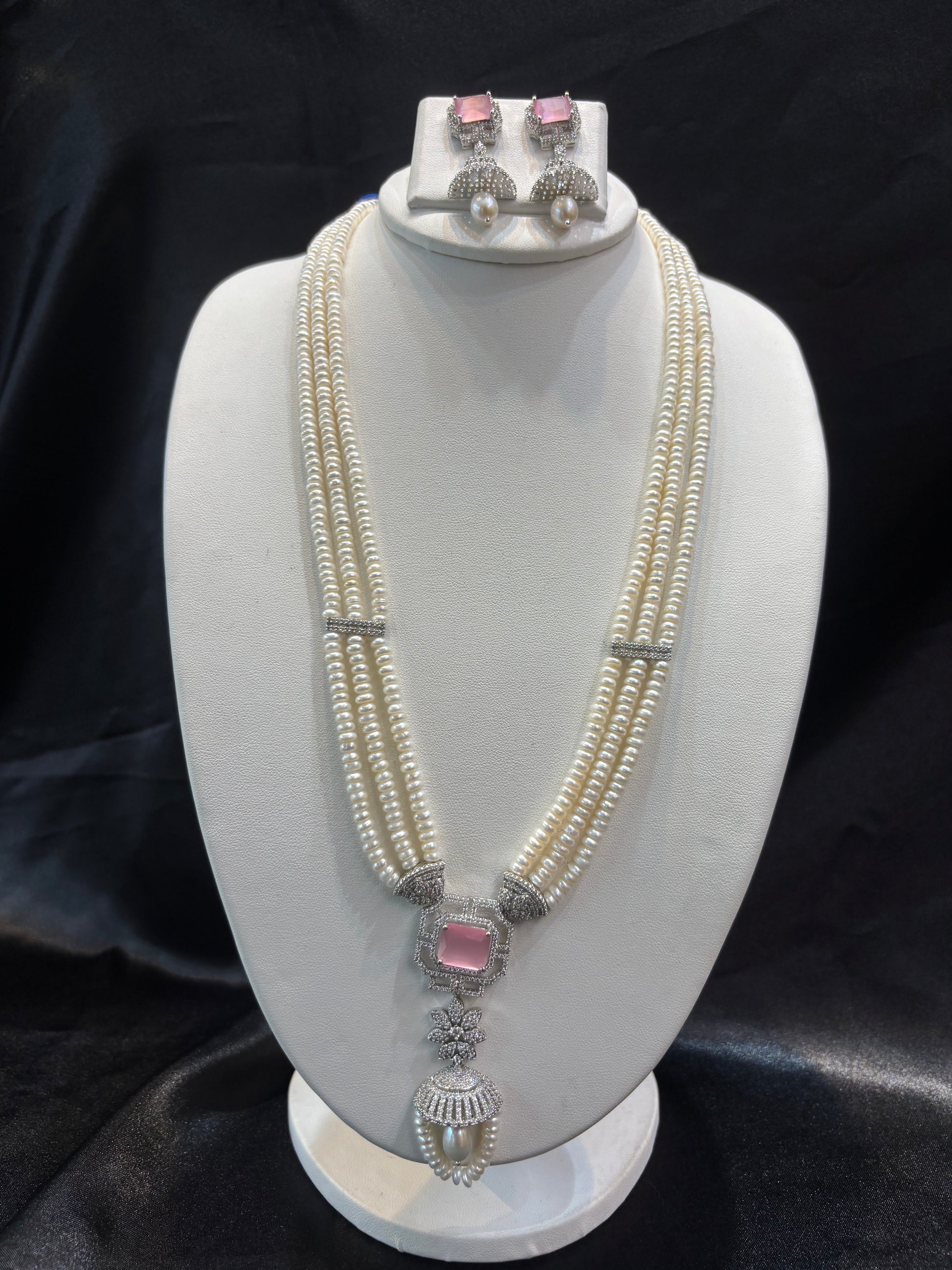 Exquisite Mini Rani Haar set with matching earrings – designed with premium pearls, a pink stone centerpiece & intricate detailing.
