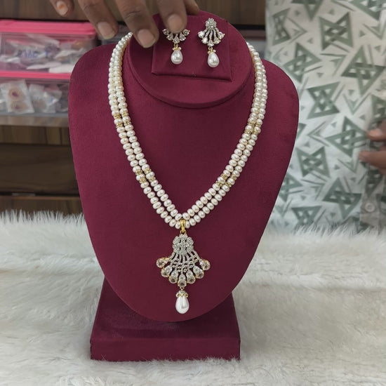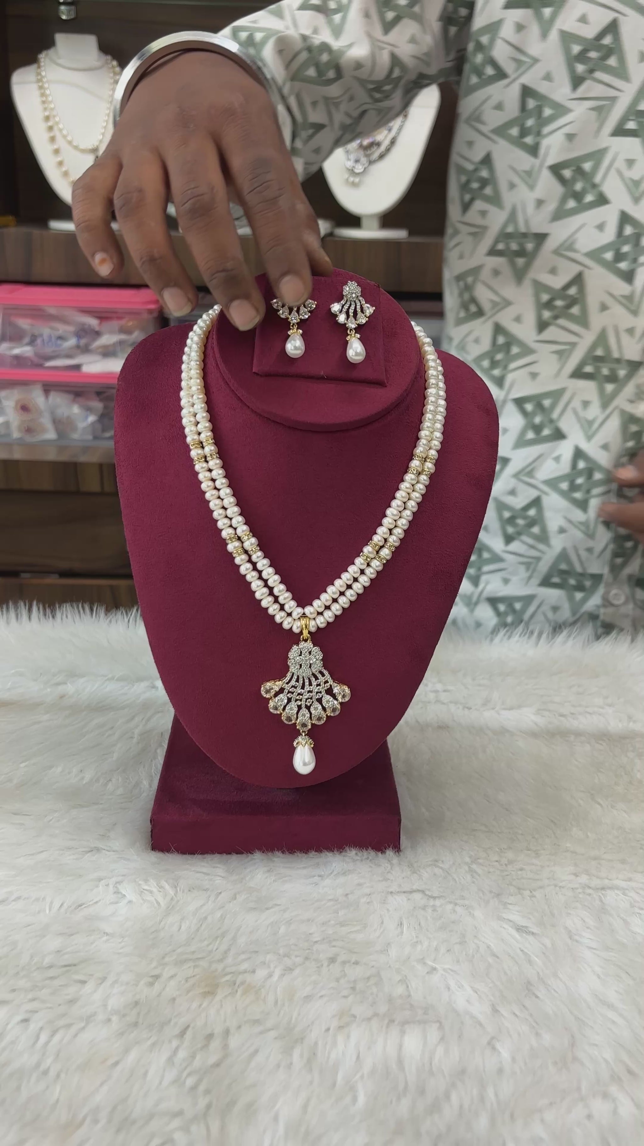 A beautifully crafted double-layer pearl necklace set paired with matching earrings. Designed with shimmering stones and a pearl drop pendant, this set is perfect for weddings, parties, and festive occasions.